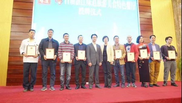 湛江市副市长欧先伟、湛江市旅游局彭晖局长为获得首届湛江味道旅游美食特色餐厅的9家企业授牌