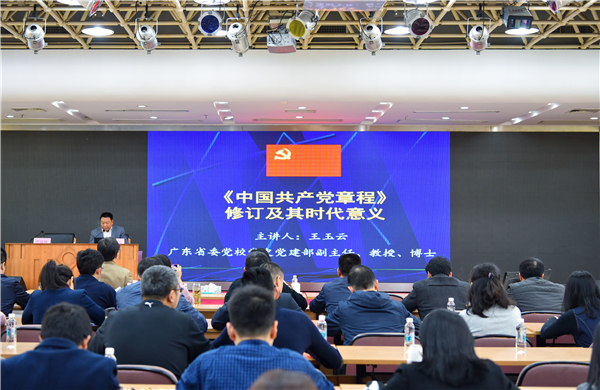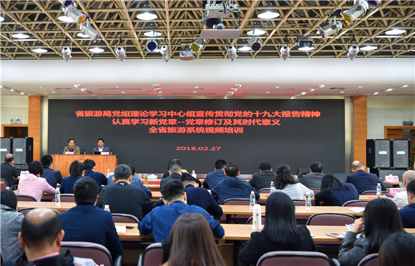 为全面贯彻党的十九大精神,以习近平新时代中国特色社会主义思想为指导,持续深入开展习近平新时代中国特色社会主义思想大学习大培训,按照《广东省旅游系统人才及局机关干部能力素质提升计划实施方案》安排,2018年2月27日上午,省旅游局在局九楼多功能厅举办了2018年第二期省旅游局党组理论学习中心组及全省旅游系统党章专题视频培训,邀请中共广东省委党校党史党建教研部副主任王玉云教授作《认真学习新党章——党章修订及其时代意义》专题授课。