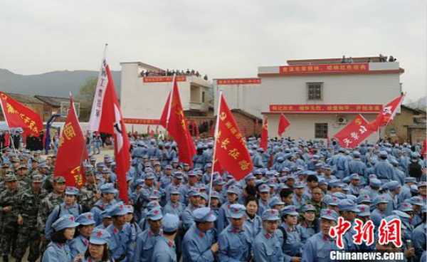 当日,在韶关南雄市油山镇上朔村人民会堂,长征题材快板表演、咏唱毛泽东诗歌《长征》、宣读“长征精神”誓词等活动先后上演。随着冲锋号吹响,包括南雄籍开国少将彭显伦后人等2300多人在此开启重走长征路,他们穿过乡间小路、田野与村庄,品尝番薯等“红军餐”,追寻革命先辈的足迹,重温革命精神。