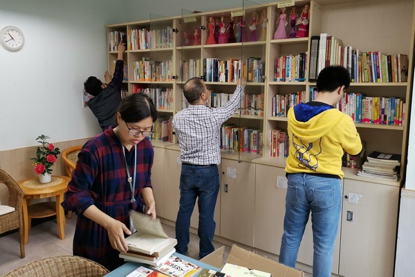 党员志愿者对图书进行整理上架