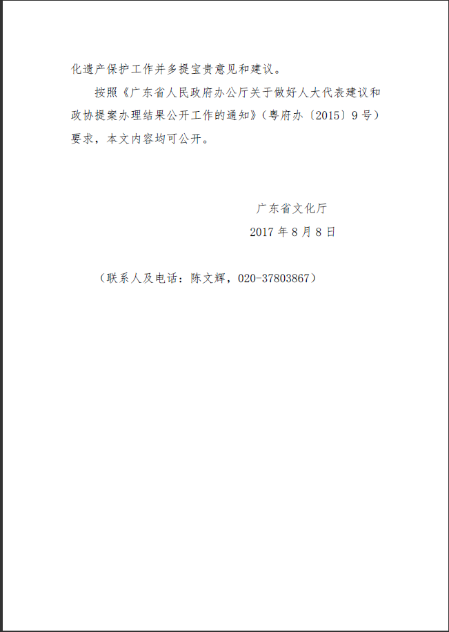 广东省文化厅关于广东省十二届人大五次会议第1557号代表建议答复的函