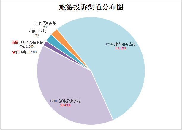 第一季度全省共接到旅游投诉1998宗,正式受理1541宗,不予受理457宗,已办结1246宗,正在办理295宗,结案率为80.86%。其中,通过各地级市12345政府服务热线接受旅游投诉1081宗,受理772宗,不予受理309宗,已办结636宗;通过“全国旅游监管服务平台(12301)”接受旅游投诉789宗,受理672宗,不予受理117宗,已办结538宗;省厅转办2宗,受理2宗;各市局政务网及局长信箱30宗,受理25宗;受理来信(函)来访投诉49宗,受理37宗,其他部门转办47宗,受理33宗。