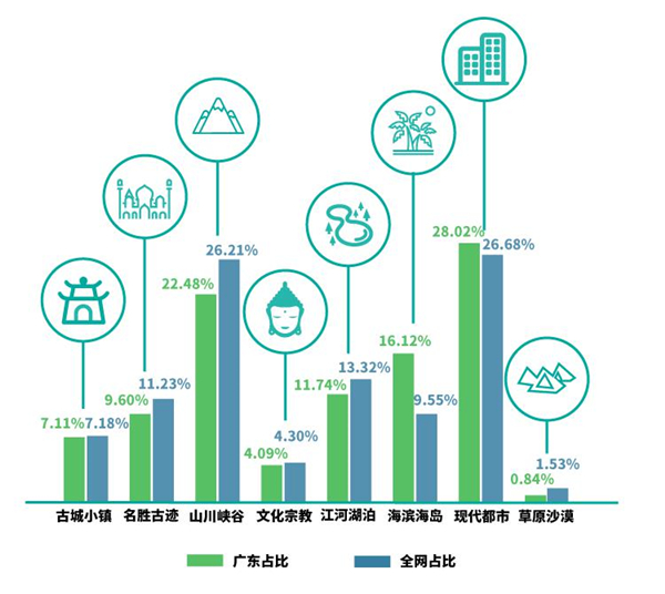 根据百度大数据、广东旅游产业大数据平台搜索数据显示,丹霞山、东部华侨城、南澳岛等景区热度在综合类排名靠前,受游客关注度最高,A级景区仍是游客关注重点;现代都市类、山川峡谷类、海滨海岛类景区为游客搜索重点,在广东景区类搜索占比达66.6%,其中,海滨海岛类景区搜索占比远高全网搜索占比6.6个百分点,表明我省滨海旅游市场畅旺,受关注程度高。