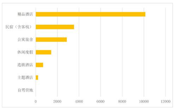 全省住宿类产品共计18874个,按精品酒店、民宿(含客栈)、公寓旅舍、休闲度假、连锁酒店、主题酒店、自驾营地划分,全省分别有10139、3533、2874、1426、676、218、8个。