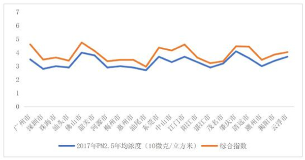 自然环境指区域PM2.5年平均值以及综合空气指数,总体看自然环境较好,广州、佛山、东莞、江门等更好一些。