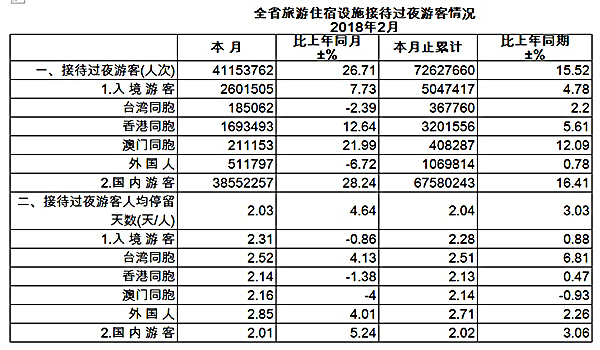 全省旅游住宿设施接待过夜游客情况(2018年2月)
