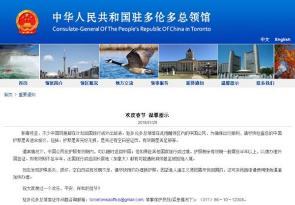 据中国驻加拿大多伦多总领事馆网站消息,新春将至,不少中国同胞在计划回国旅行或外出旅游。驻多伦多总领馆在此提醒领区内的中国公民,为确保出行顺利,请尽快检查您的中国护照是否适合旅行,包括:护照是否完好无损,是否还有空白签证页,有效期是否足够等。