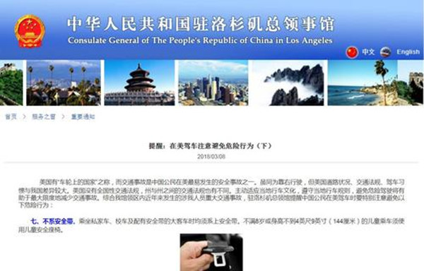 中国驻洛杉矶总领馆总结在美国交通安全问题,提醒中国公民在美驾车注意避免危险行为。