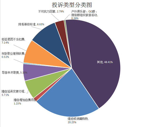 按投诉类别划分,投诉热点主要集中在:投诉旅行社强迫或诱骗购物降低等级标准、退团不当扣费、擅自变更行程、导游未尽职责、不可抗力因素、擅自增加自费项目等问题。数据显示,投诉旅行社强迫或诱骗购物312宗,占全部投诉的20.25%;降低等级标准133宗,占全部投诉8.63%;游客退团不当扣费110宗,占全部投诉的7.14%;擅自变更行程88宗,占全部投诉的5.71%导游未尽职责79宗,占全部投诉的5.13%;不可抗力因素43宗,占全部投诉的2.79%;擅自增加自费项目19宗,占全部投诉的1.23%;户外俱乐部、QQ群、微信群组织旅游活动6宗,占全部投诉0.39%;年龄职业差别收费5宗,占全部投诉的0.32%;其他投诉746宗,占全部投诉48.41%。