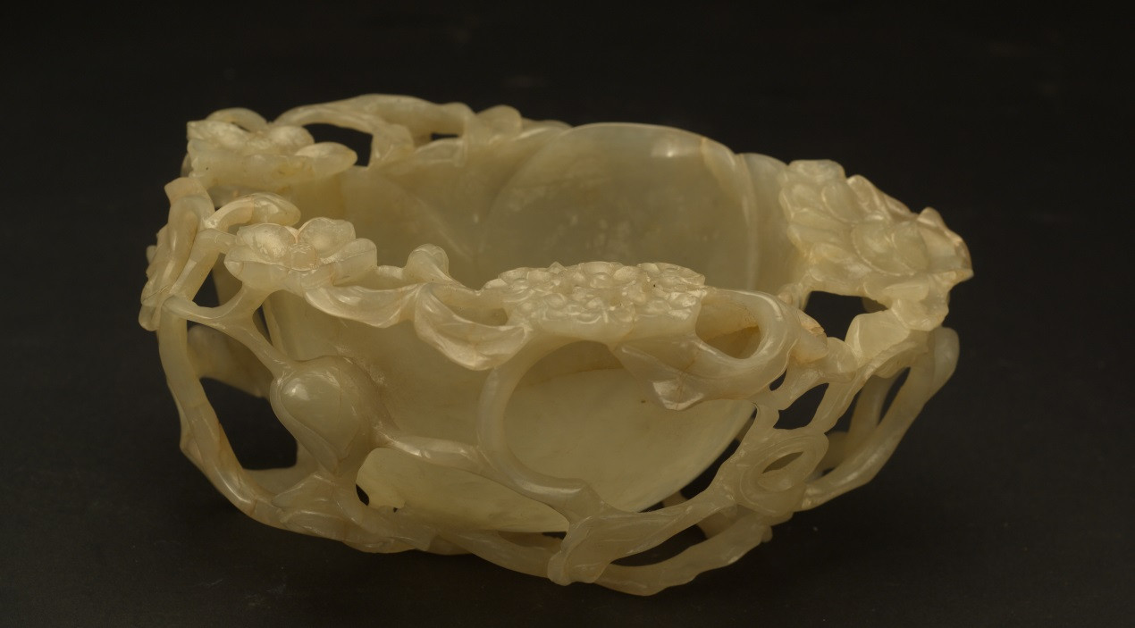 白玉,玉质莹润,杯以折枝花为形,撇口,深腹,莲花枝杆由口沿向下弯曲沿腹部伸展至杯底部,以浮雕、镂通雕的形式巧做成莲花形杯的把柄和底足。