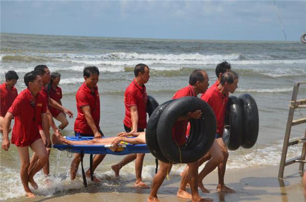 本次演练模拟了第一滩景区海浴救生瞭望亭当班救生员发现海面出现险情(有人员遇溺)后,组织人员进行施救的过程。同时,值班领导联系海事部门船只协助外围搜救,联系边防派出所实施岸上搜救、接应,联系医院进行抢救。第一滩义务救生员对“溺水者”进行施救、担架抬上岸、清理鼻口腔异物、输氧、人工呼吸等急救操作;急救演练后,开展了200米体能游泳和20秒25米速度游泳演练。