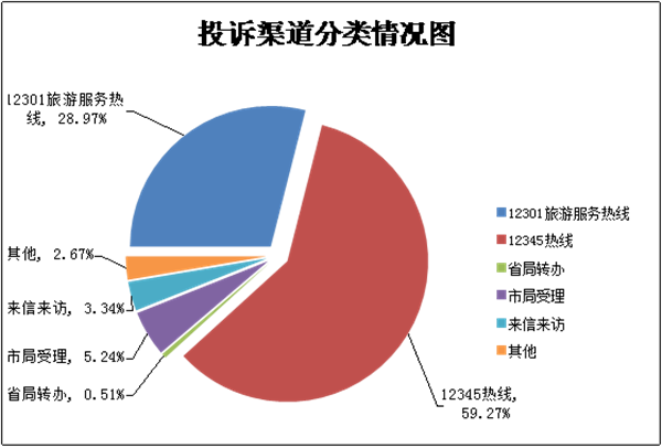 第三季度,全省共接到旅游投诉1947宗,正式受理1531宗,不予受理416宗,已办结1312宗,正在办理219宗,结案率为85.70%。其中,通过各地级市12345政府服务热线接受旅游投诉1154宗,受理970宗,不予受理184宗,已办结811宗;通过“全国旅游监管服务平台(12301)”接受旅游投诉564宗,受理356宗,不予受理208宗,已办结299宗,正在办理57宗;省局转办(包括省局政务网及省质监所转办)10宗,受理9宗;市局政务网及局长信箱102宗,受理87宗;受理来信(函)来访投诉65宗,受理58宗,其他部门转办52宗,受理51宗。