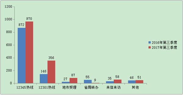 2017年第三季度12301共受理旅游投诉356宗,占总受理数23.25%。与去年第三季度相比增加210宗,同比增长143.84%,占总投诉量的比重上升了10.89百分点。主要原因是我省加大对12301旅游服务热线的宣传推广工作,引导游客投诉举报使用12301平台。12301服务平台涵盖语音接听、PC端、手机端、微信端等多种接受投诉形式,方便了游客进行投诉举报。