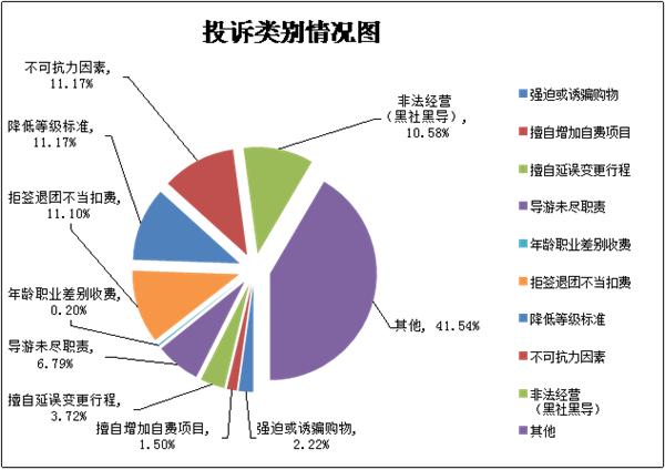 投诉11.17%;因不可抗力因素171宗,占全部投诉的11.17%;在游客出国旅游被拒签后,拒签退团不当扣费170宗,占全部投诉的11.10%;非法经营(黑社黑导)162宗,占全部投诉的10.58%;导游未尽职责104宗,占全部投诉的6.79%;擅自变更行程57宗,占全部投诉的3.72%;强迫或诱骗购物34宗,占全部投诉的2.22%;擅自增加自费项目23宗,占全部投诉的1.50%;年龄职业差别收费3宗,占全部投诉的0.20%;其他投诉636宗,占全部投诉41.54%。