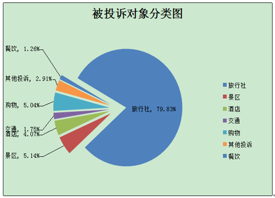 (三)被投诉对象重点仍然是旅行社。投诉旅行社主要表现在拒签后退团不当扣费、降低等级标准、擅自变更行程、导游服务质量问题。投诉景区景点主要表现在开放时间、票价问题、交通路线、基础设施和景区景点工作人员服务态度等问题。