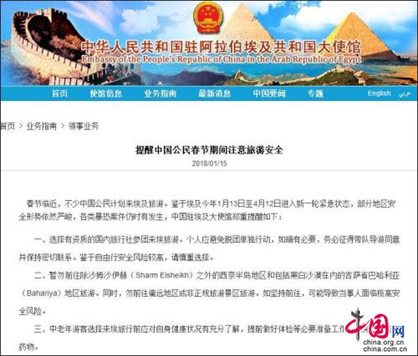 中国网1月16日讯 记者近日从中国驻阿拉伯埃及共和国大使馆网站获悉,在春节探亲旅游小高峰期间,不少中国公民计划赴埃及旅游。鉴于埃及于当地时间2018年1月13日至4月12日进入新一轮紧急状态,部分地区安全形势依然严峻,各类暴恐案件仍时有发生,中国驻埃及大使馆郑重提醒如下: