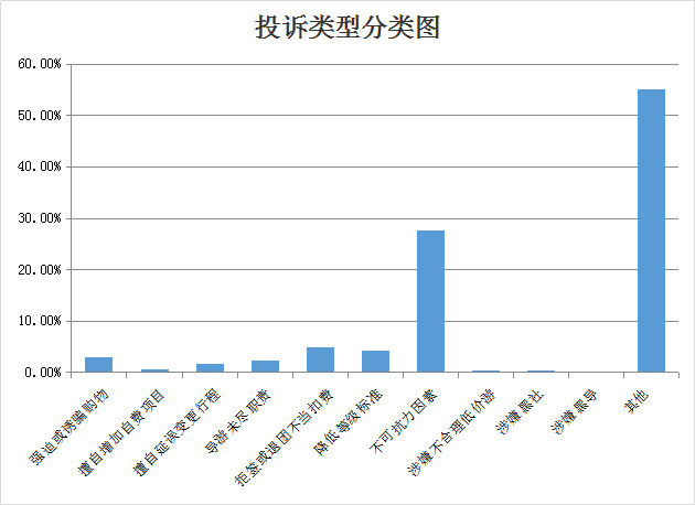 从受理案件的投诉类别划分,投诉热点主要集中在:投诉因不可抗力因素退团退费、拒签或退团不当扣费、旅行社降低等级标准、强迫或诱骗购物、导游未尽职责、擅自延误变更行程和擅自增加自费项目等问题。数据显示,投诉涉及不可抗力因素587宗,占全部投诉的27.63%;拒签或退团不当扣费104宗,占全部投诉的4.89%;降低等级标准90宗,占全部投诉的4.24%;强迫或诱骗购物64宗,占全部投诉的3.01%;导游未尽职责48宗,占全部投诉的2.26%;擅自延误变更行程36宗,占全部投诉的1.69%;擅自增加自费项目14宗,占全部投诉的0.66%;涉嫌不合理低价游8宗,占全部投诉的0.38%;涉嫌黑社4宗,占全部投诉的0.19%;涉嫌黑导1宗,占全部投诉的0.05%;其他1169宗,占全部投诉的55.01%。