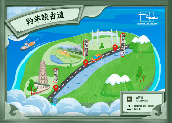 游径线路:(羚羊炮台)—(清风阁摩崖石刻)—羚羊峡古道—景福围堤—(崇禧塔)