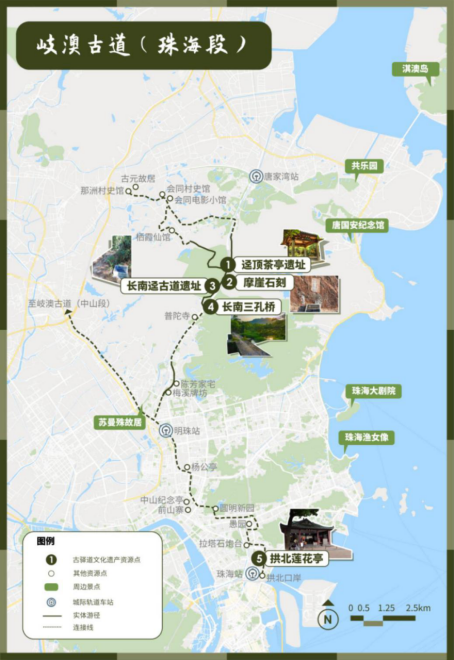 岐澳古道(珠海段)曾经走出了无数影响甚至改变近代中国命运的先驱和重要人物,至今沿线还留存着许多古镇、古村以及名人故居等,是清代广东政府治理香山、管理珠江口西岸海防、管辖澳门的交通动脉,是中央政府对澳门管控的鲜活见证,同时,也是近代大量新思想、新文化、新信息传播到中国广阔的内陆地区的主要路径。岐澳古道(珠海段)包含东西两段,东段以长南径古道遗存为主,西段则一路延伸与岐澳古道(中山段)对接。