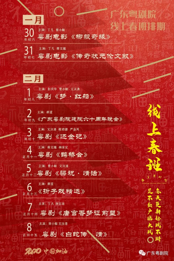 感谢广大观众对广东粤剧院“线上春班”的支持,疫情当前,我们坚信万众一心,齐心合力,一定能战胜疫情。应观众要求,我们的“线上春班”将一直延长到元宵节,为大家在“抗疫”的同时,送上丰富多彩的精神粮食。